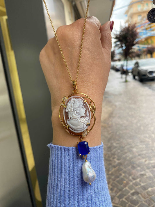 Collana Cammeo Volto Donna Con Quarzo Blu e Perla