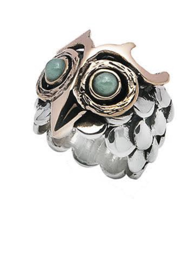 Anello Nemoris Civetta in argento 925 e bronzo con Spinelli di smeraldi